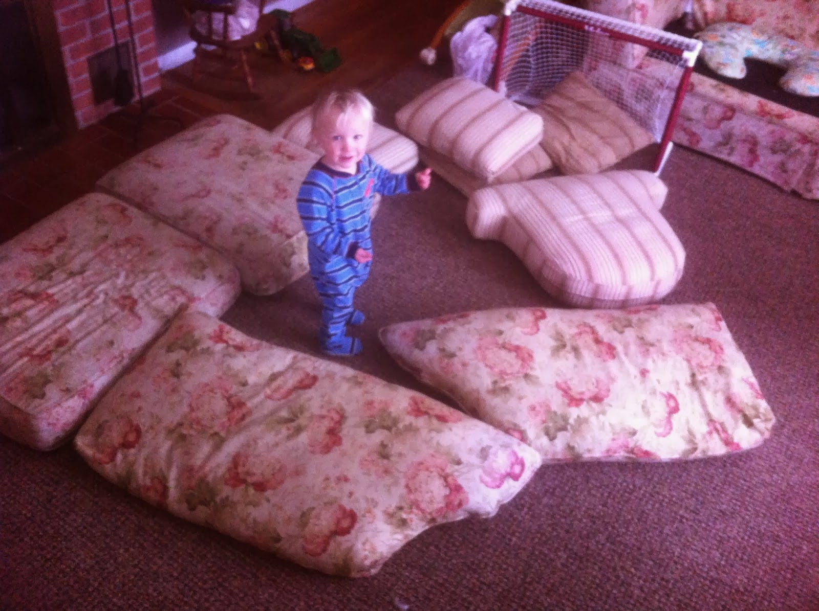 In the photo directly above, Lukey, who is 20 months old, is challenging his balance by walking across the soft, unsteady couch cushions while also engaging his vestibular and proprioceptive systems. Looking at the middle photo, Henry is in the background dragging the cushions off of the couch and placing them on the floor. This is a great 'Heavy Work' activity that can organize and calm a child. The sky is the limit and pretend play is the cornerstone to our couch cushion game. Often times, children have a difficult time expanding on their play skills. Using a concrete item such as couch cushions and pretending they are sharks, for example, works to expand play and creativity. Adult facilitation may be needed to enhance these skills, but that depends on the age, level of pretend play and the goal. This game also works on gross motor skills (again, walking on the cushions and jumping from the cushionless couches, aka boats to the docks!). Turn taking is also involved and a great deal of social interaction is going on! All in all, our Saturday morning is not lacking in skill building while having a blast!